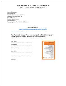 Tjondro, Elisa and PATULI, LIJUNTRI and JAPAR, RICHARD ANDRIANTO and JULITHA, DELITHA (2020) Tax Authority Versus Peer Communication: The Influence of Trust, Service Climate, and Voluntary Cooperation. Jurnal Ilmiah Akuntansi dan Bisnis, 15 (1). pp. 61-74. ISSN p-ISSN 2302-514X, e-ISSN 2303-1018