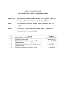 Pertiwi, Dewi and Kusumawardhani, Adhityawati and PRATAMA, JAMES TAN KRISTIYANTO and Paul, Teripena Ika Sampurna (2024) Investigating the Impact: Financial Literacy, Socio-Economic Status, and Awareness on Investment Decisions with Moderation Factors. [UNSPECIFIED]
